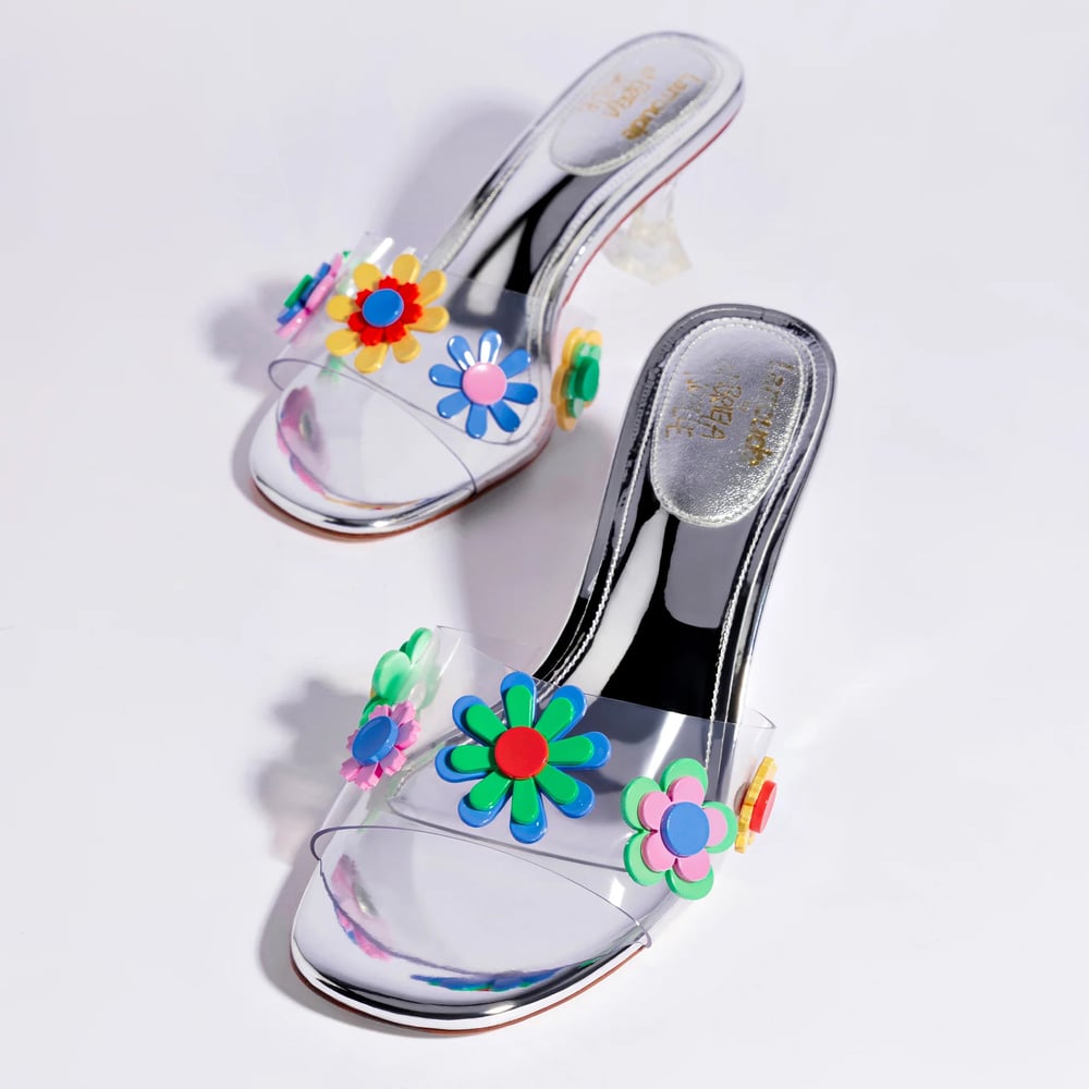 As children, we fantasized about growing up and dressing up - as adults we can transport back to childhood with these clear acrylic and vinyl mules featuring flowers inspired by Gabriela’s unique acrylic sculptures.